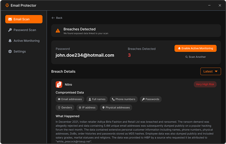 Email Protector keeps your accounts safe by detecting breaches, monitoring exposures, and alerting you instantly. Scan your emails and passwords securely, review detailed reports, and take action before it's too late.